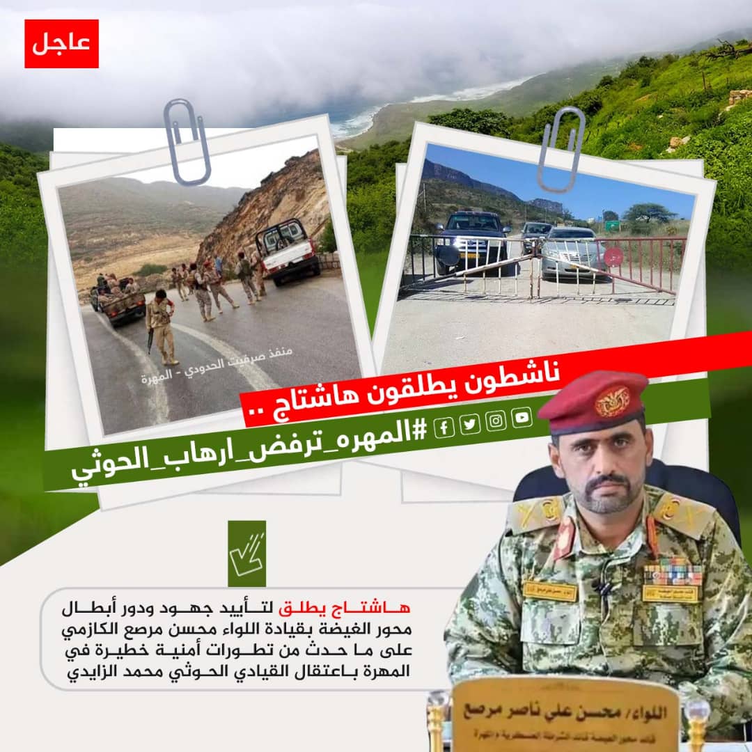 وتزامن الهاشتاج مع التطورات الأمنية الخطيرة الأخيرة التي شهدتها محافظة المهرة، والمتمثلة في اندلاع اشتباكات مسلحة أعقبت عملية اعتقال أحد القيادات الحوثية، وهو القيادي الحوثي (محمد أحمد الزايدي) في منفذ صرفيت الحدودي مع سلطنة عُمان وما تبع ذلك من هجوم مسلح استهدف القوة الأمنية في محاولة لتهريب القيادي المعتقل مما أسفر عن سقوط شهيد من أبطال قوات محور الغيضة ووقوع عدد من الجرحى، وكذا اعتقال ابن اخت القيادي الحوثي محمد أحمد الزايدي.