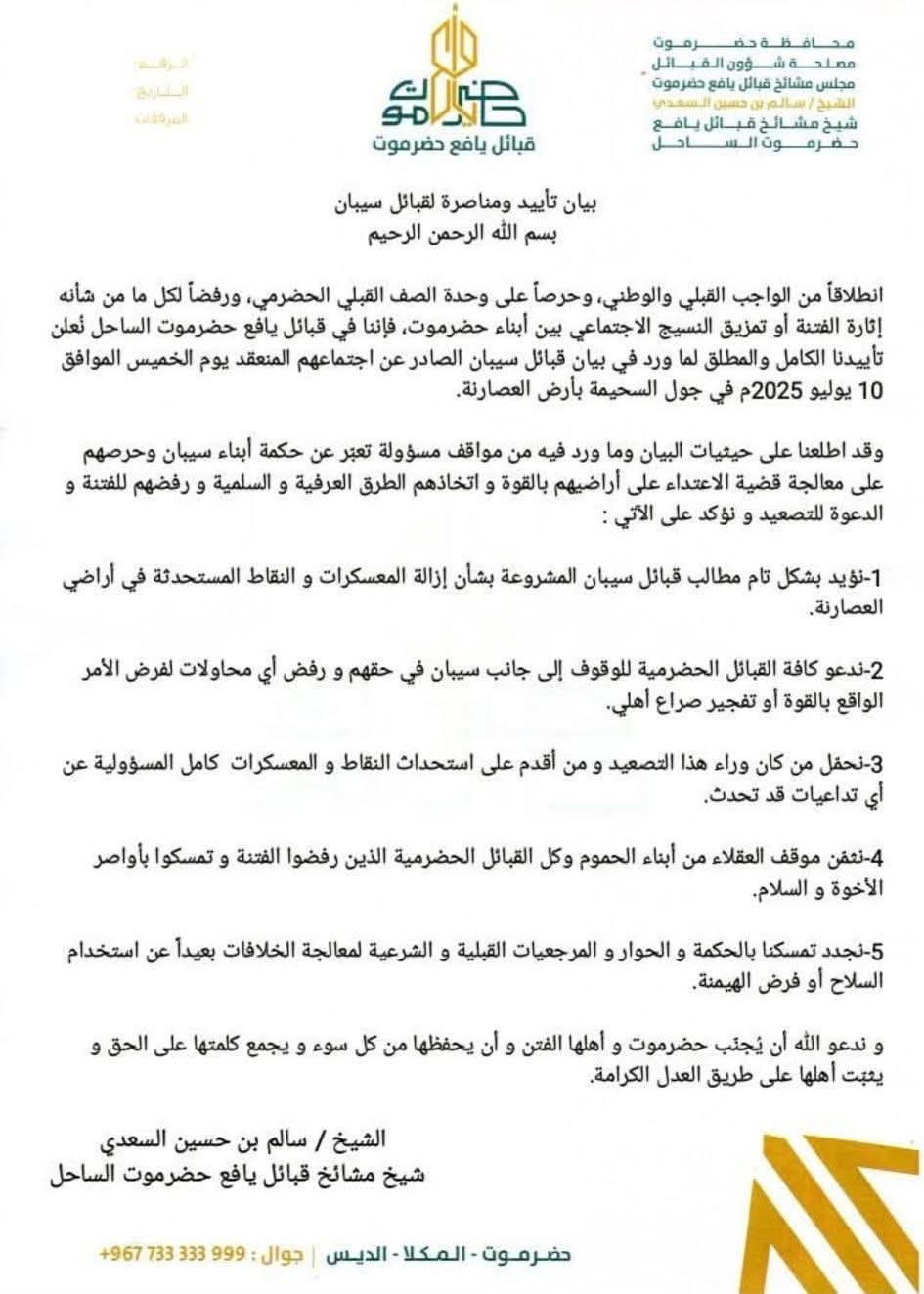 أعلنت قبائل يافع في حضرموت، في بيان رسمي، تأييدها الكامل لمطالب قبائل سيبان بإزالة المعسكرات والنقاط المستحدثة في أرض العصارنة، مؤكدة رفضها لاستخدام القوة وفرض الأمر الواقع على القبائل.