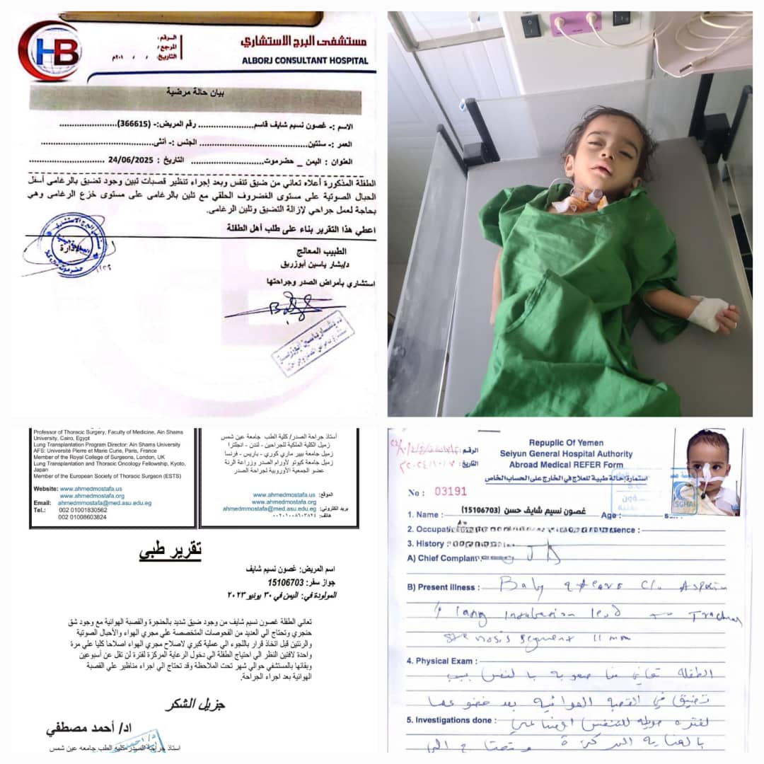 غصون نسيم شايف قاسم (من منطقة التالق – حمادة)، طفلة لم تتجاوز عامها الثاني، تعاني من تضيق حاد في الحنجرة والقصبة الهوائية. لا تستطيع الكلام، ولا تتنفس من أنفها أو فمها كباقي الأطفال، بل عبر فتحة جراحية في الرقبة. حالة مؤلمة تجعل كل لحظة في حياتها معركة من أجل الهواء.
