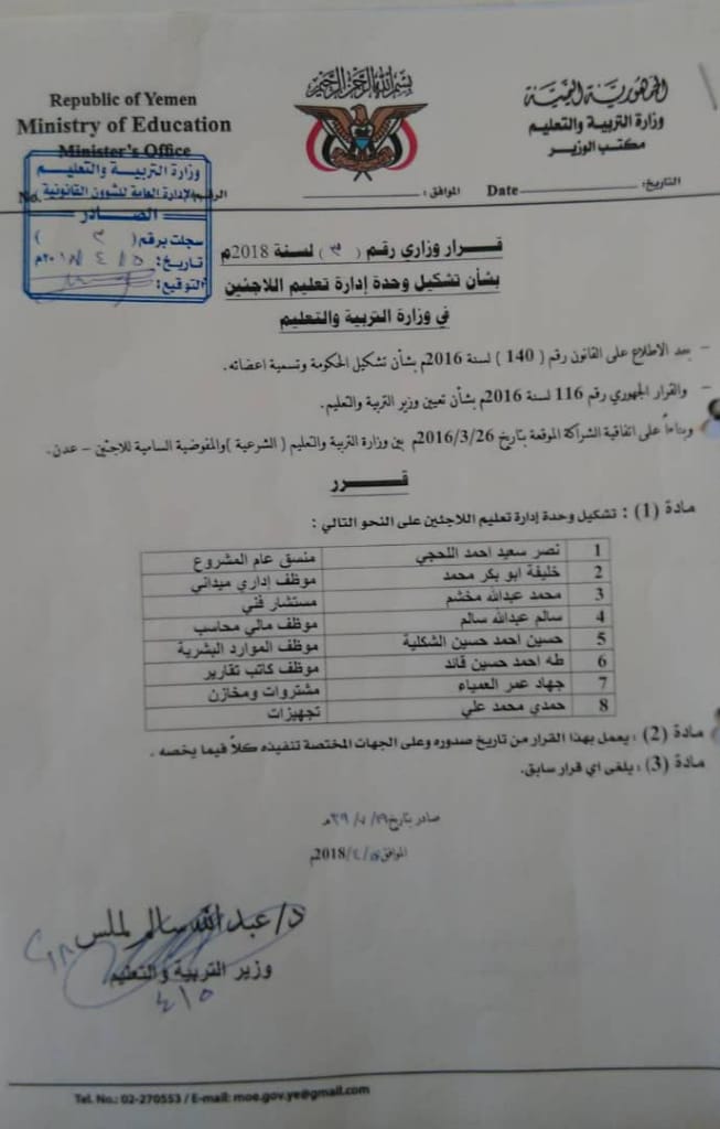 صدر قرار وزاري رقم (٣) لسنة ٢٠١٨م بشأن تشكيل وحدة ادارة تعليم اللاجئين في وزارة التربية وتعليم قضت المادة الاولى منه تشكيل وحدة ادرة تعليم اللاجئين