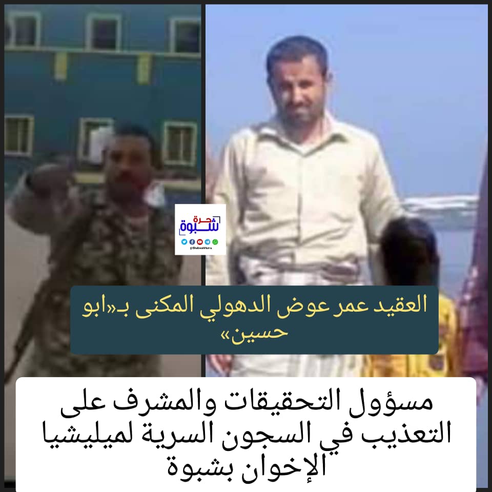 وكشفت مصادر موثوقة ان الإخواني العقيد عمر عوض الدهولي الذي يخفى إسمه الحقيقي خلف الكنية “ابوحسين” المعروف بها وهو من مديرية بيحان مسؤول التحقيقات بمعسكر الشهداء واحد قيادات ميليشيا الإخوان الإرهابية (القوات الخاصة) وايضا يشرف ويقوم بتعذيب جنود النخبة الشبوانية في معسكر الشهداء مستخدماً الكهرباء وأساليب بشعة ومختلفة ومتعددة نفسية وجسدية ويمنع عنهم الشرب والاكل لساعات طويلة.