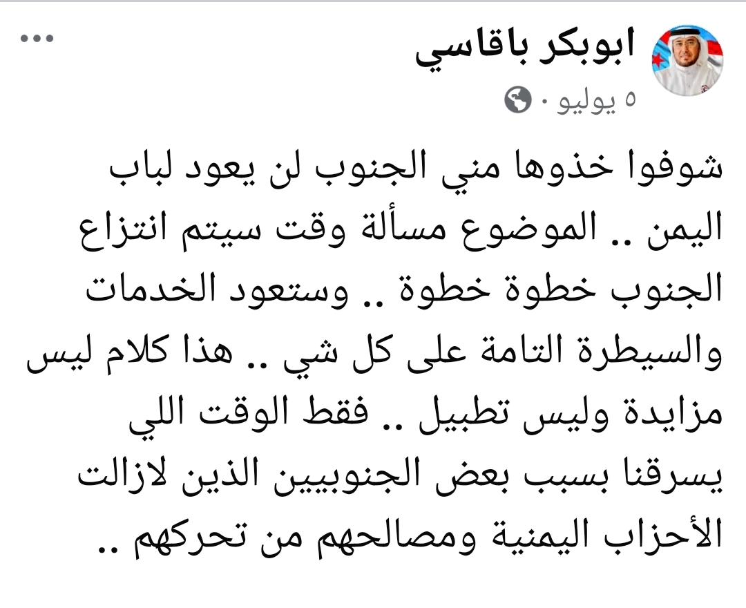 كلمات قالها المناضل الجنوبي ( أبو بكر باقاسي )، لكنها لم تكن مجرد جملة عابرة. كانت بمثابة مانيفستو سياسي صادق، يلخص حقيقة يعيشها الجنوبيون، لا نظرية تنظرها النخب.