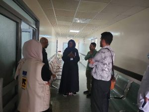 وطاف المديرد/ المحرابي مع الوفد الأجنبي الزائر لبعض الأقسام مثل أقسام الرقود واقسام العمليات، وقسم العزل، وقسم المختبر، وقسم العناية المركزة، ومخازن المستشفى، ودورات المياه، وقسم العيادات الخارجية