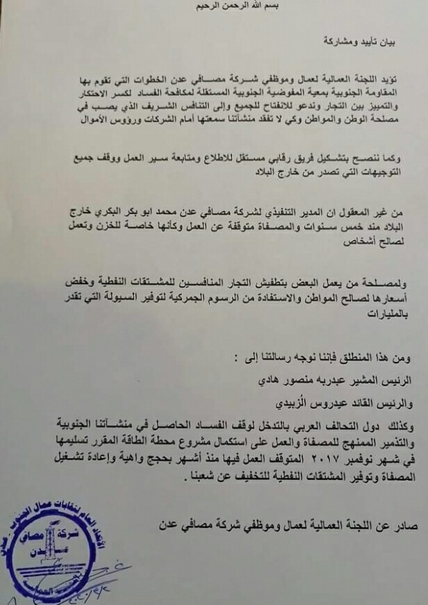 وناشد البيان الرئيس عيدروس الزُبيدي رئيس المجلس الانتقالي الجنوبي والرئيس اليمني المؤقت عبدربه منصور هادي وقيادات التحالف العربي بالتدخل لوقف الفساد في المنشآت الجنوبية والتدمير الممنهج للمصفاة.