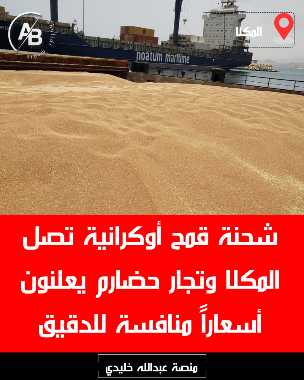 وافادت المصادر عن وصول اليوم إلى ميناء المكلا السفينة RIDER قادمة من أوكرانيا ومحملة بشحنة كبيرة من القمح لصالح تجار حضارم، في خطوة تعكس تصاعد المنافسة في قطاع الحبوب والدقيق.