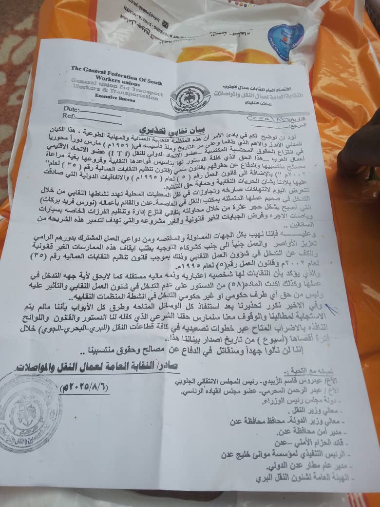 وحذرت النقابة في سياق البيان في حالة استمرار ممارسات بركات المناهضة لعمل النقابة فإنها ستلجأ إلى ممارسة حقها الدستوري في الإضراب وبخطوات تصعيدية في كافة قطاعات النقل ( البري – البحري – والجوي ) وذلك خلال فترة اقصاها أسبوع من تاريخ اصدار هذا البيان.