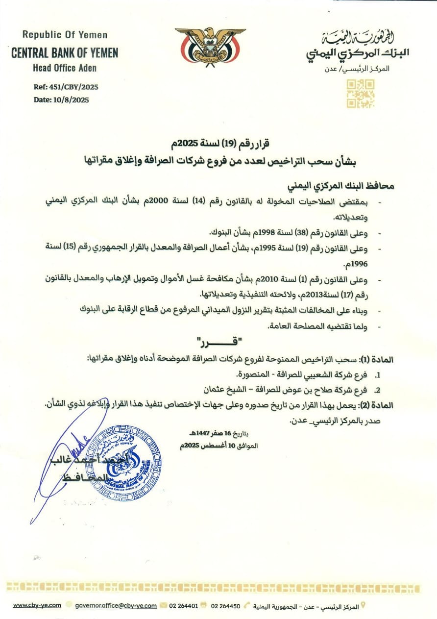 أصدر محافظ البنك المركزي أ. أحمد أحمد غالب قرار رقم (19) لعام 2025م، بشأن سحب التراخيص الممنوحة لعددٍ من فروع شركات الصرافة المخالفة وإغلاق مقراتها، والمثبتة بتقرير النزول الميداني المرفوع من قطاع الرقابة على البنوك.