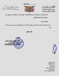 أصدر النائب العام للجمهورية تعميماً قضائياً يقضي بالتعامل الحصري بالعملة المحلية (الريال اليمني) في جميع المعاملات التجارية والخدمية داخل المناطق والمحافظات المحررة استناداً إلى قرار مجلس الوزراء رقم (13) لعام 2025 بشأن حظر استخدام العملات الأجنبية بديلاً عن الريال اليمني مؤكدا على العمل بموجب القرار واتخاذ الإجراءات القانونية من يخالف ذلك.