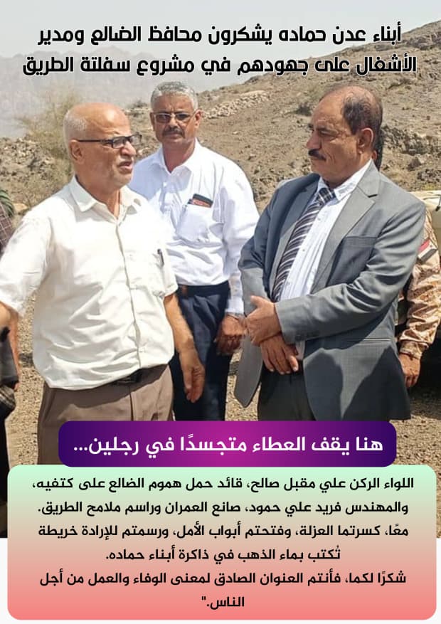 أعرب أبناء وشباب وأعيان منطقة عدن حماده بمحافظة الضالع عن خالص شكرهم وتقديرهم لمحافظ المحافظة اللواء الركن علي مقبل صالح، ومدير مكتب الأشغال العامة والطرق المهندس فريد علي حمود، على جهودهما الكبيرة في الدفع بمشروع سفلتة طريق عدن حماده نحو التنفيذ، بعد سنوات من المتابعة الحثيثة والعمل الميداني.