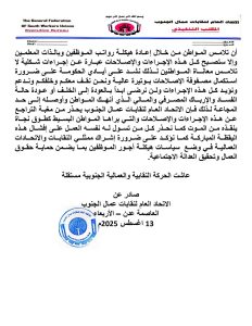 الاتحاد العام لنقابات عمال الجنوب يصدر بيانا هاما