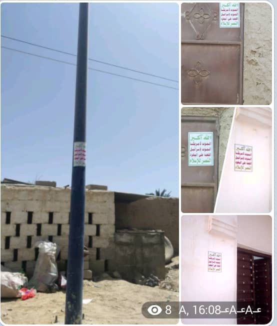 حيث شوهدت الملصقات الحوثية على جدران بعض البيوت وعلى إنارات بعض شوارع سيئون