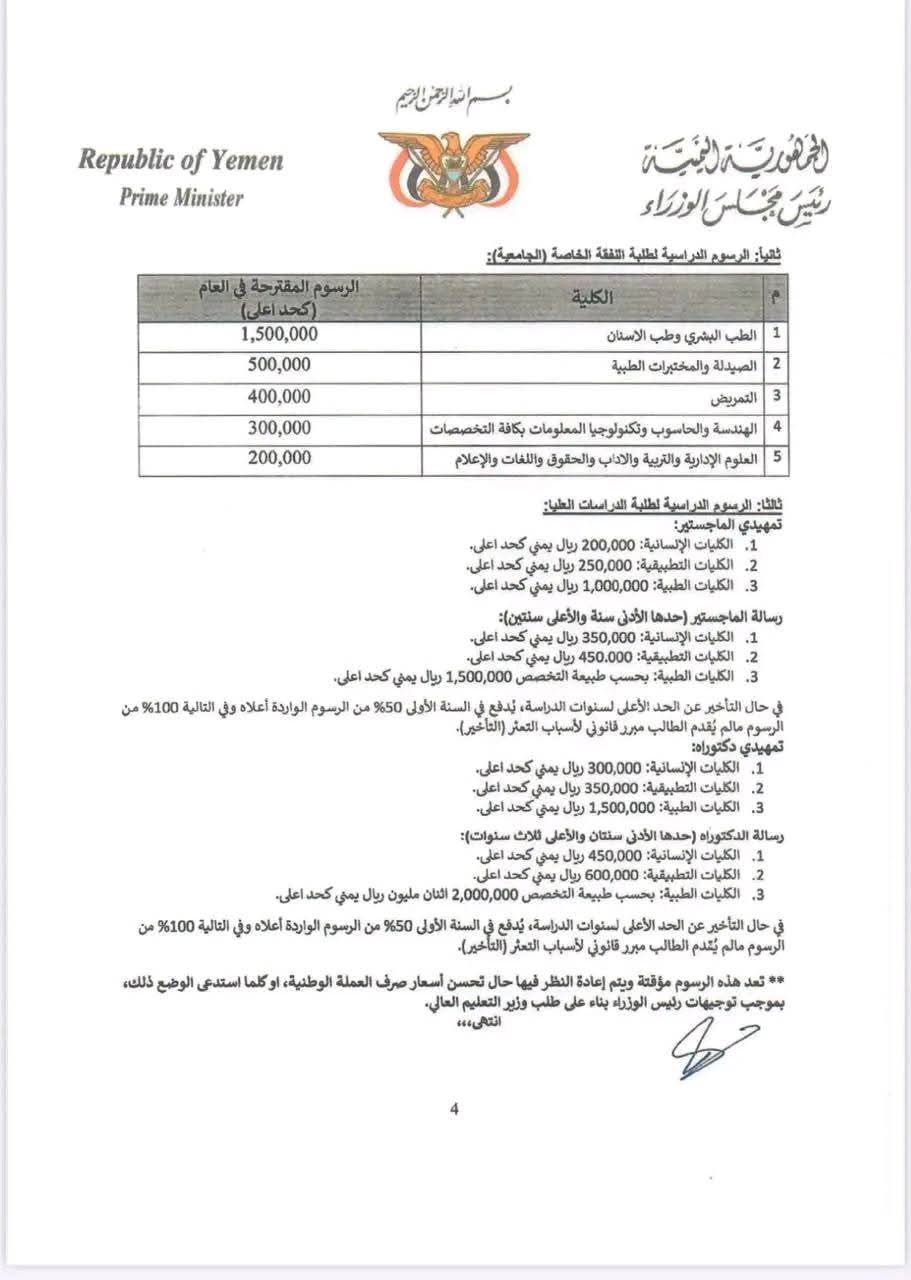 الكليات الطبية بحسب طبيعة التخصص 1,500,000 ريال يمني كحد اعلى