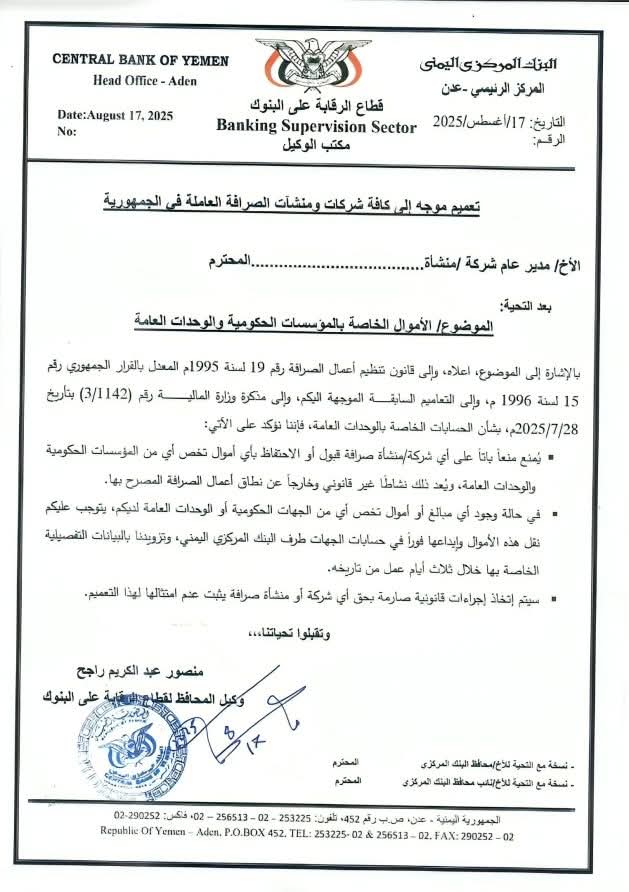 اليوم.. حسمت الامور بعد تتبع ورصد موثق لذا اصدر محافظ البنك المركزي تعميما موجها لكافة شركات ومنشات الصرافة العاملة، بشأن الاموال الخاصة بالمؤسسات الحكومية والوحدات العامة