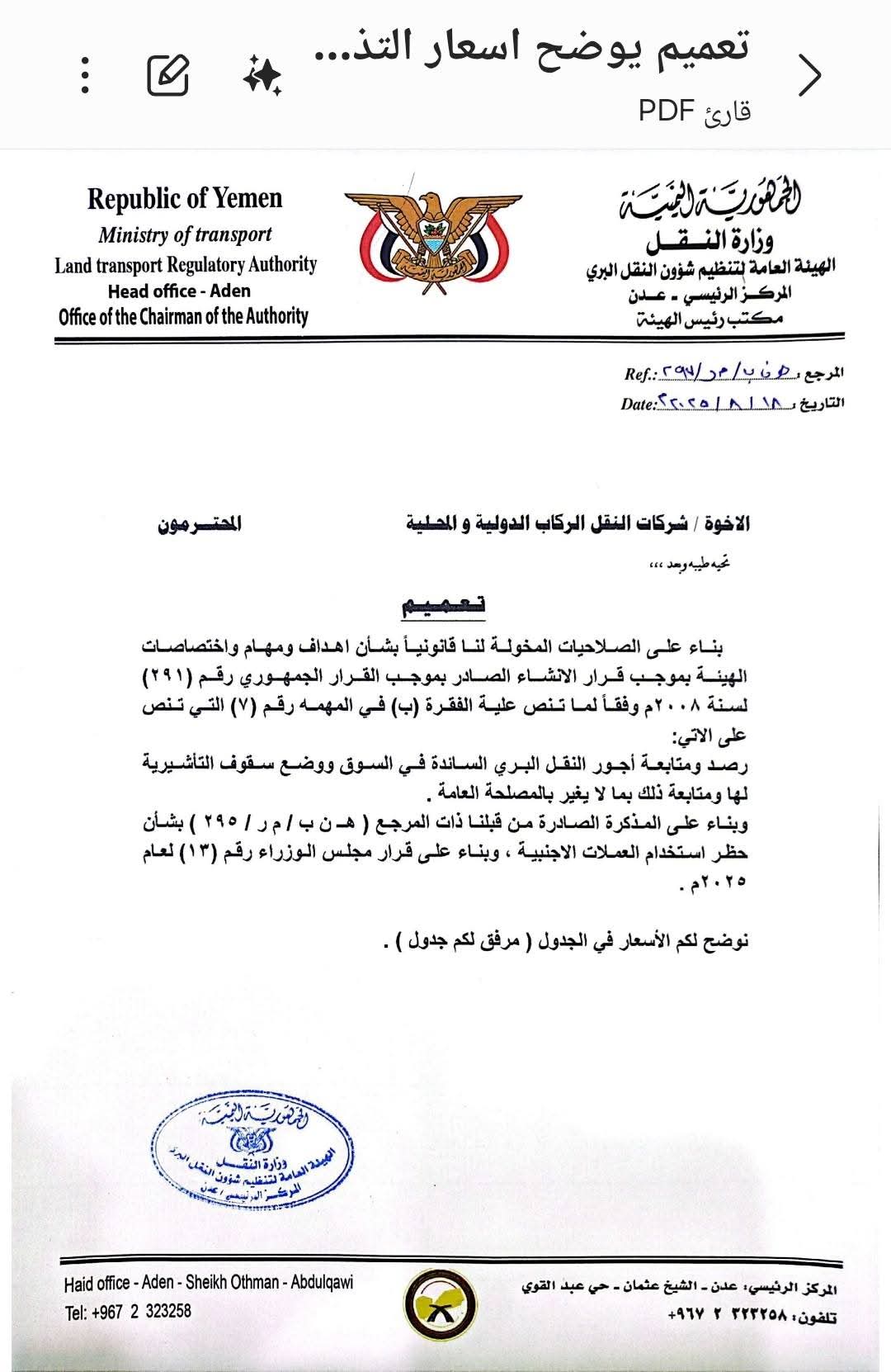 أصدرت الهيئة العامة لتنظيم شؤون النقل البري في اليمن، تعميماً موجهاً لشركات النقل البري الدولية والمحلية، أكدت فيه على ضرورة رصد ومتابعة أجور النقل السائدة في السوق.