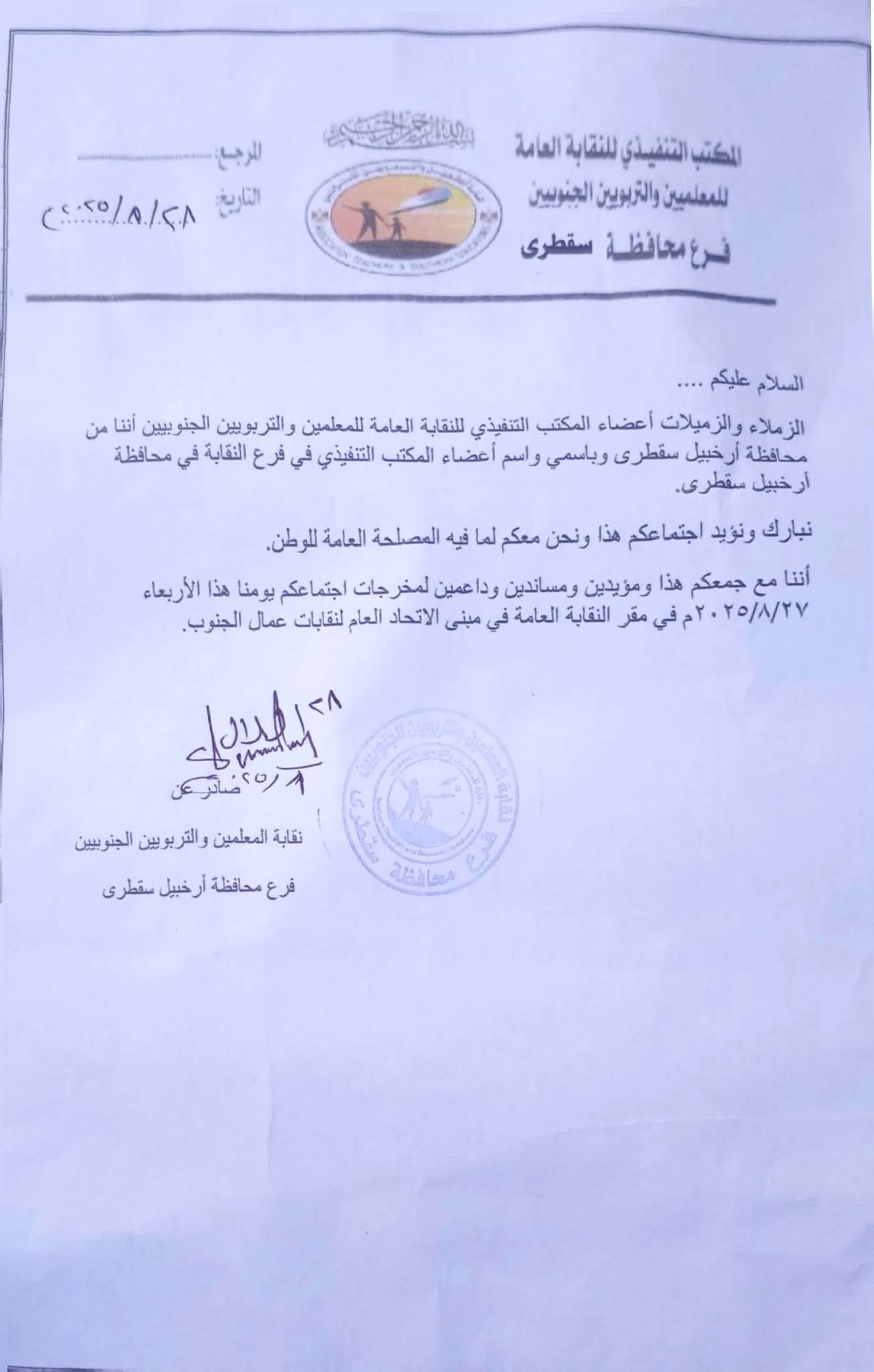 واكد رئيس نقابة المعلمين والتربويين الجنوبيين فرع أرخبيل سقطرى أ. سلال جمعان أن فرع النقابة تؤيد بشكل كامل وتبارك اجتماع المكتب التنفيذي للنقابة العامة للمعلمين والتربويين الجنوبيين الذي انعقد الأربعاء الموافق 27 أغسطس 2025، في مقر النقابة العامة بمبنى الاتحاد العام لنقابات عمال الجنوب.