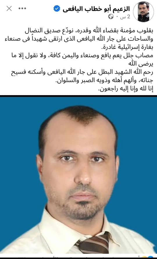 نشر مقرب من وزير الثقافة الحوثي {علي جار الله} ويدعى “ابو خطاب اليافعي” تغريدة يؤكد مصرعه في الغارة الإسرائيلية يوم الخميس الماضي.