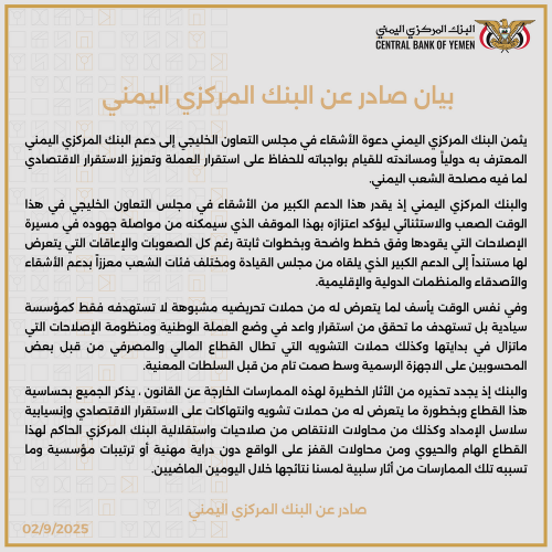 يثمن البنك المركزي دعوة الأشقاء في مجلس التعاون الخليجي إلى دعم البنك المركزي المعترف به دولياً ومساندته للقيام بواجباته للحفاظ على استقرار العملة وتعزيز الاستقرار الاقتصادي لما فيه مصلحة الشعب.