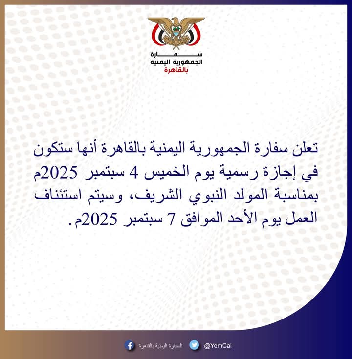 أثار إعلان سفارة اليمن لدى جمهورية مصر العربية يوم الخميس 4 سبتمبر 2025م، منح موظفيها إجازة رسمية بمناسبة ذكرى المولد النبوي الشريف واستئناف الدوام يوم الأحد 7 سبتمبر، موجة جدل واسعة بين أوساط النشطاء والمهتمين بالشأن العام معتبرين القرار خطوة مثيرة للريبة تشبه في مضمونها توجهات مليشيات الحوثي الانقلابية.