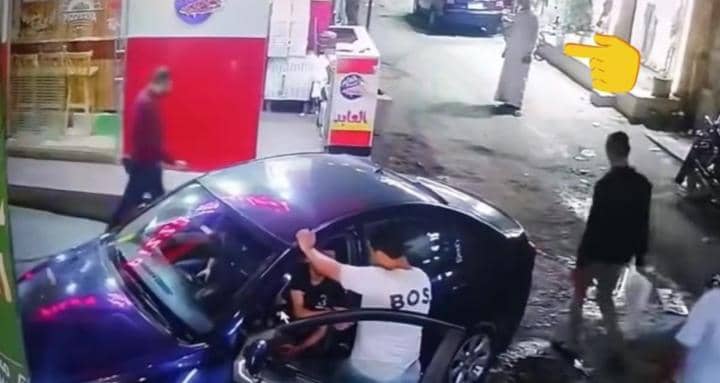 ويظهر في الفيديو الذي صورته كاميرا مراقبة في الشارع، أحد الأشخاص وهو يستوقف سيارة ويتحدث مع سائقها قبل أن يخرجه من السيارة لاستكمال الحديث بالخارج، ثم ينضم إليه أحد الأشخاص للاعتداء على قائد السيارة ومرافقه.