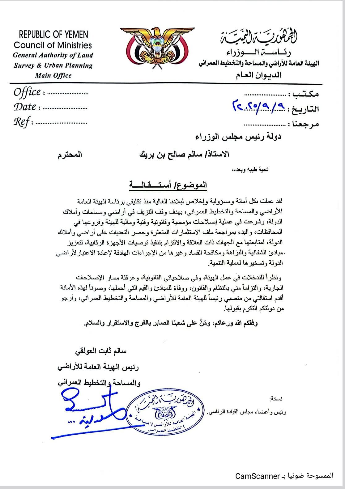 قدّم رئيس الهيئة العامة للأراضي والمساحة والتخطيط العمراني، سالم ثابت العولقي، استقالته من منصبه اليوم (الثلاثاء 9 سبتمبر 2025)، في رسالة رسمية بعثها إلى رئيس مجلس الوزراء سالم صالح بن بريك.