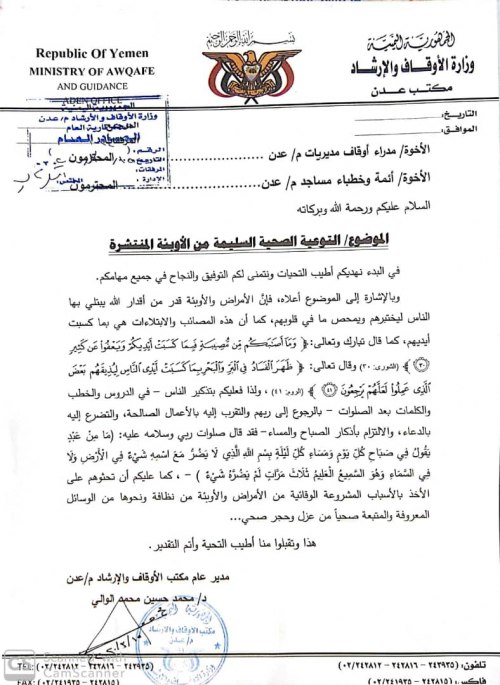 دعت إدارة مكتب الأوقاف والإرشاد لعدن أئمة وخطباء مساجد عدن للتوعية الصحية السليمة من الأوبئة والأمراض المنتشرة.