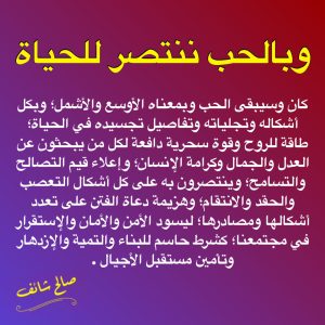 كان وسيبقى الحب وبمعناه الأوسع والأشمل؛ وبكل أشكاله وتجلياته وتفاصيل تجسيده في الحياة؛ طاقة للروح وقوة سحرية دافعة لكل من يبحثون عن العدل والجمال وكرامة الإنسان؛وإعلاء قيم التصالح والتسامح؛ وينتصرون به على كل أشكال التعصب والحقد والانتقام ؛ وهزيمة دعاة الفتن على تعدد أشكالها ومصادرها؛ ليسود الأمن والأمان والإستقرار في مجتمعنا؛ كشرط حاسم للبناء والتمية والإزدهار وتأمين مستقبل الأجيال
