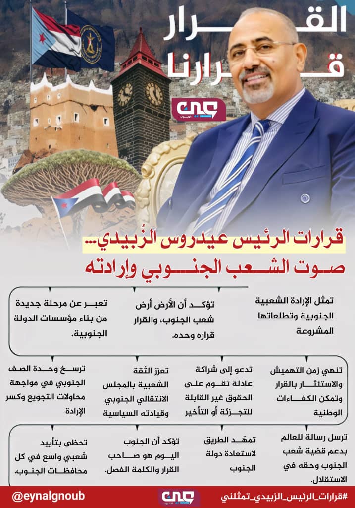 وإن من يظن أن تلك القرارات مجرد تعديلات إدارية فهو واهم بل هذه القرارات هي تجسيد لمبدأ الجنوب أولا. ولقد جاءت لتمكين الكفاءات الجنوبية التي طالما تم إقصاؤها، ولتؤكد أن القرار في أرض الجنوب هو قرار جنوبي خالص لا يخضع لأي ضغوط أو إملاءات من اي جهة، إنها خطوة حاسمة لضرب محاولات التهميش والاستئثار التي عطلت مؤسسات الدولة، ولهذا يلتف الشعب حولها لأنها تعيد الحقوق إلى أهلها، وهذا التمكين يربطنا مباشرة بذكرى ثورة 14 أكتوبر واهدافها، ويؤكد أن مسيرة التحرير مستمرة بلا توقف.