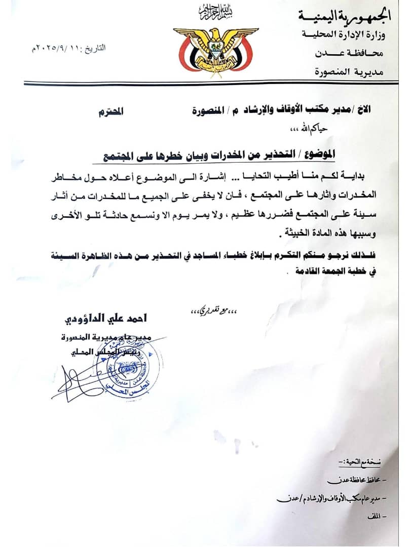 شهدت مساجد مديرية المنصورة في العاصمة عدن، الجمعة الموافق 12 سبتمبر 2025م، تخصيص خطب للتوعية بمخاطر المخدرات على الإنسان والمجتمع، وذلك بتوجيهات من مدير عام المديرية الأستاذ أحمد علي الداؤودي، وبالتنسيق مع مكتب الأوقاف بالمديرية.