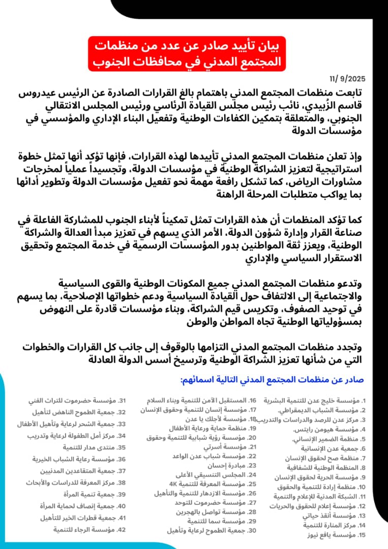 بيان تأييد صادر عن عدد من منظمات المجتمع المدني في محافظات الجنوب