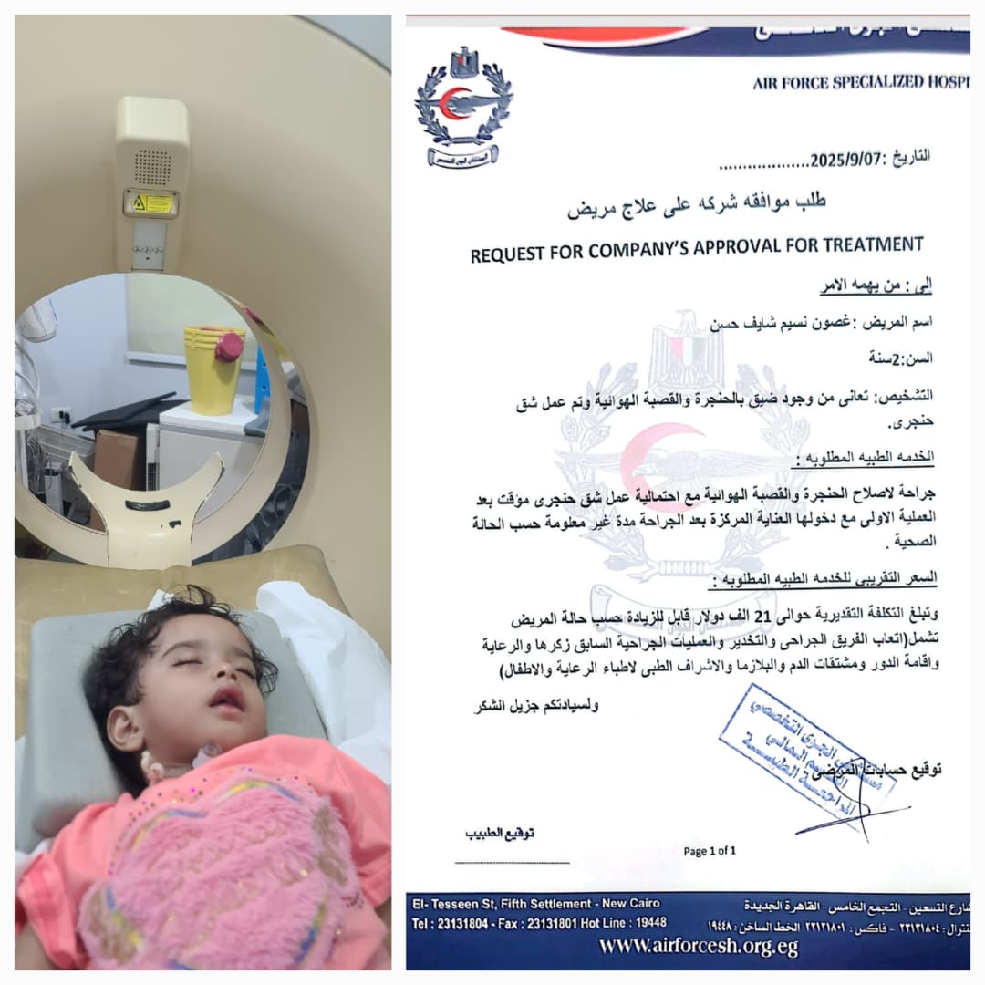 غصون، التي لم تتجاوز سنتين من عمرها القليلة، ترقد تتواجد في أحد القاهرة بانتظار عملية جراحية عاجلة تُنقذ حياتها..لكن الأطباء حددوا تكلفة العملية بنحو 21 ألف دولار، وهو مبلغ يفوق قدرات أسرتها البسيطة التي طرقت كل الأبواب دون جدوى.