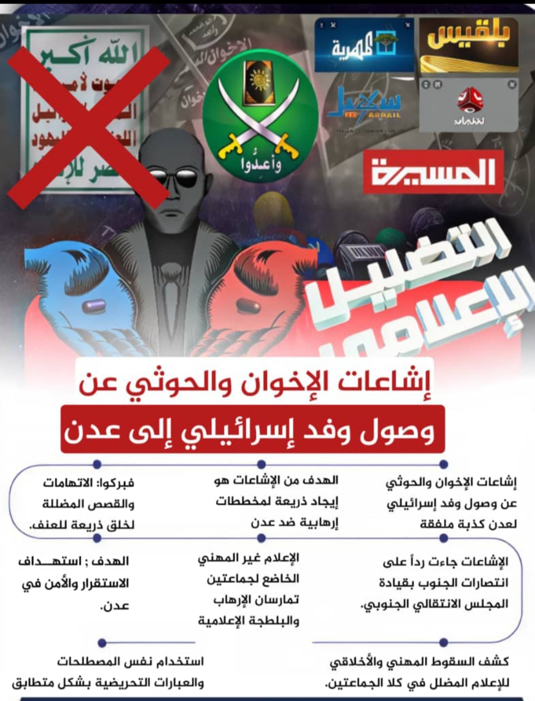 وفضحوا التخادم والسقوط الأخلاقي والمهني للإعلام الحوثي والإخواني، وذلك بعد بثهما إشاعات كاذبة عن تواجد إسرائيلي في العاصمة الجنوبية عدن.