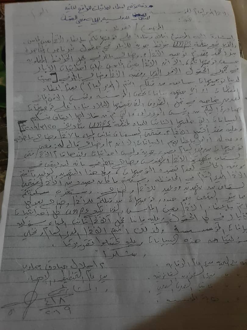 وبالعودة الى الرسالة الموجهة الى مدير المياه السابق م. علوي المحضار، انه وبناء على توجيهاتكم باعطاء ( معين الماس ) التابع لمنظمة ( UNPS) (خرائط جوية ) لابار المياه في حقول بئر ناصر والمناصرة وبئر أحمد، إلا ان ( الماس ) طلب احداثيات لجميع الابار في حقول المياه وهو ما رفضه الاخ ( م. وضاح باطرفي ) المكلف بعمل الخرائط الجوية.
