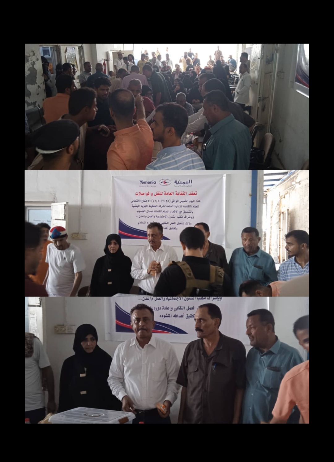 إقيم يومنا هذا الخميس في 2/10/2025 اجتماع انتخابي للجنة الادارة العامة للخطوط الجوية اليمنية في مقرها في خورمكسر إنتخاب لجنة نقابية بإشراف مباشر من النقابة العامة للنقل والمواصلات، ومكتب الشؤون الاجتماعية والعمل للعاصمة عدن، وبحضور رئيس النقابة العامة «خالد محمد احمد»، والامين العام لاتحاد العام لنقابات عمال الجنوب الاستاذ/ عبدالمجيد القاضي، والاستاذ/عبدالحكيم سالم الاسد، رئيس الرقابة والتفتيش للاتحاد، وقحطان الميسري، مندوب مكتب الشؤون الاجتماعية والعمل بالعاصمة عدن