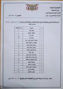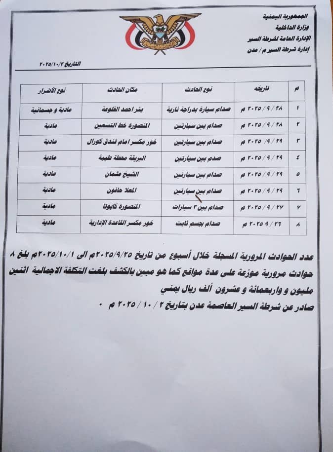 وفيما يخص الحوادث المرورية، أوضحت الإحصائية أن العاصمة عدن شهدت خلال الفترة نفسها (8) حوادث مرورية في عدد من المديريات، مسجّلة انخفاضًا بنسبة 43% مقارنة بالأسبوع السابق، مع خسائر مادية تقدَّر بنحو 2,420,000 ريال (مليونين وأربعمائة وعشرون ألف ريال).