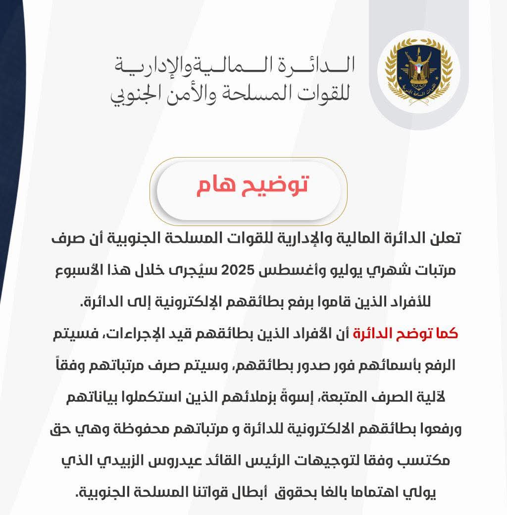 أعلنت الدائرة المالية والإدارية للقوات المسلحة والأمن الجنوبي اليوم الثلاثاء 7 أكتوبر 2025، عن بدء صرف مرتبات شهري يوليو وأغسطس 2025 خلال هذا الأسبوع، للأفراد الذين استكملوا رفع بطائقهم الإلكترونية إلى الدائرة.