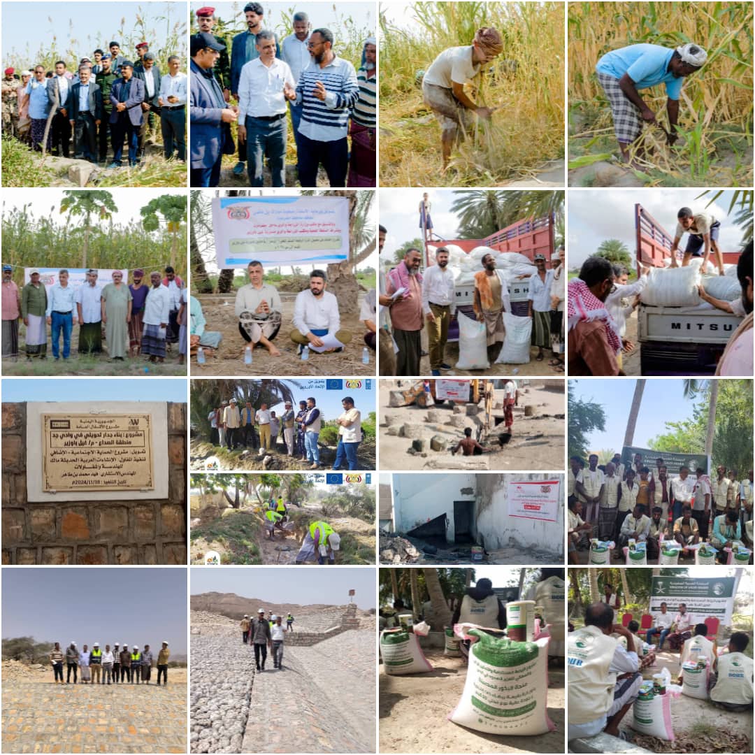 أما على صعيد المشاريع الزراعية الأخرى، فقد تم تنفيذ أربعة مشاريع بتمويل من البنك الدولي بالشراكة مع الصندوق الاجتماعي للتنمية ومشروع الاشغال العامة، شملت مشروع تحديد أولويات المجتمع في تجمعات الصداع وحباير والقارة، وتأهيل (17500) متر طولي من قنوات الري في ستة معايين زراعية (النقب، الصداع وحباير، وادي سرور، الفجرة، لشول، الحرث) وتم تنفيذها من خلال التعاقدات المجتمعية، كما تم توزيع أشجار “غرسات” الليم على المزارعين بتنفيذ من الصندوق الاجتماعي للتنمية.