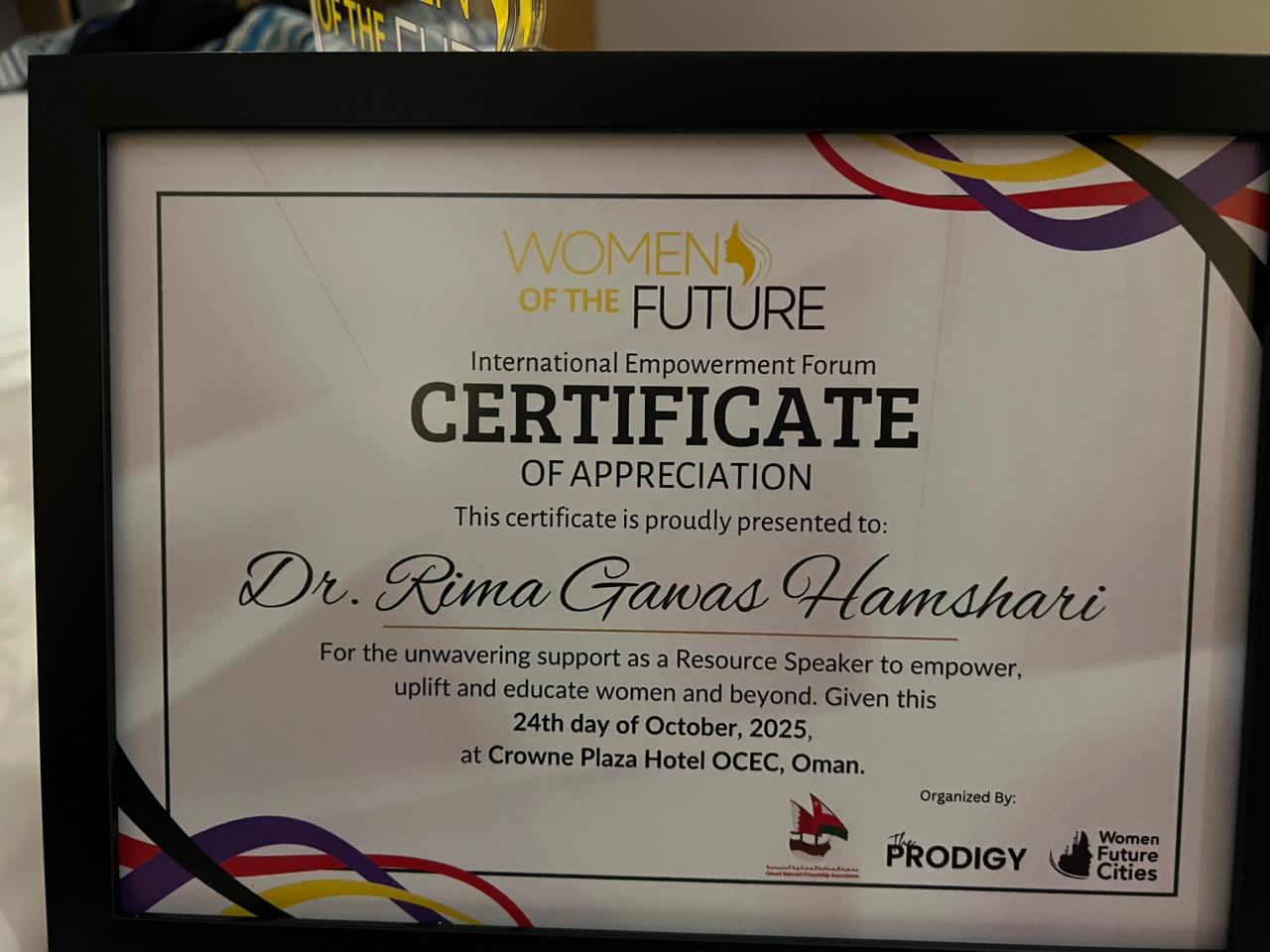 تكريم د. ريما همشري في منتدى التمكين الدولي بمسقط تقديراً لدورها في دعم وتمكين المرأة