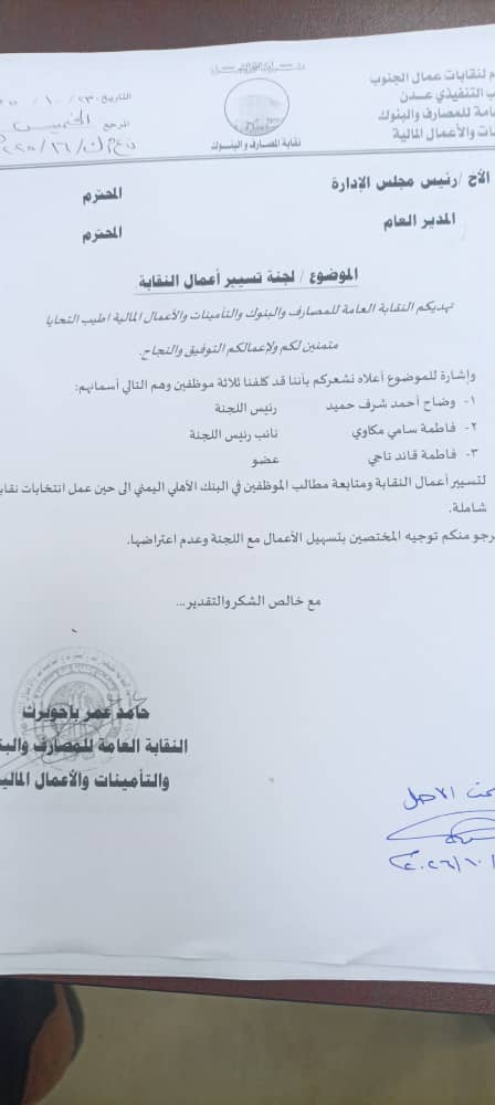 في خطوة مسؤولة تعكس روح القيادة والحكمة النقابية، أصدر رئيس نقابة المصارف والبنوك الأستاذ حامد با حويرث قرارًا بتشكيل لجنة لتسيير أعمال نقابة البنك الأهلي اليمني، وذلك عقب قرار إيقاف النقابة من قبل الاتحاد العام لنقابات عمال الجنوب، حتى يتم حل الإشكالات القائمة أو إجراء انتخابات جديدة وفق اللوائح المنظمة للعمل النقابي.