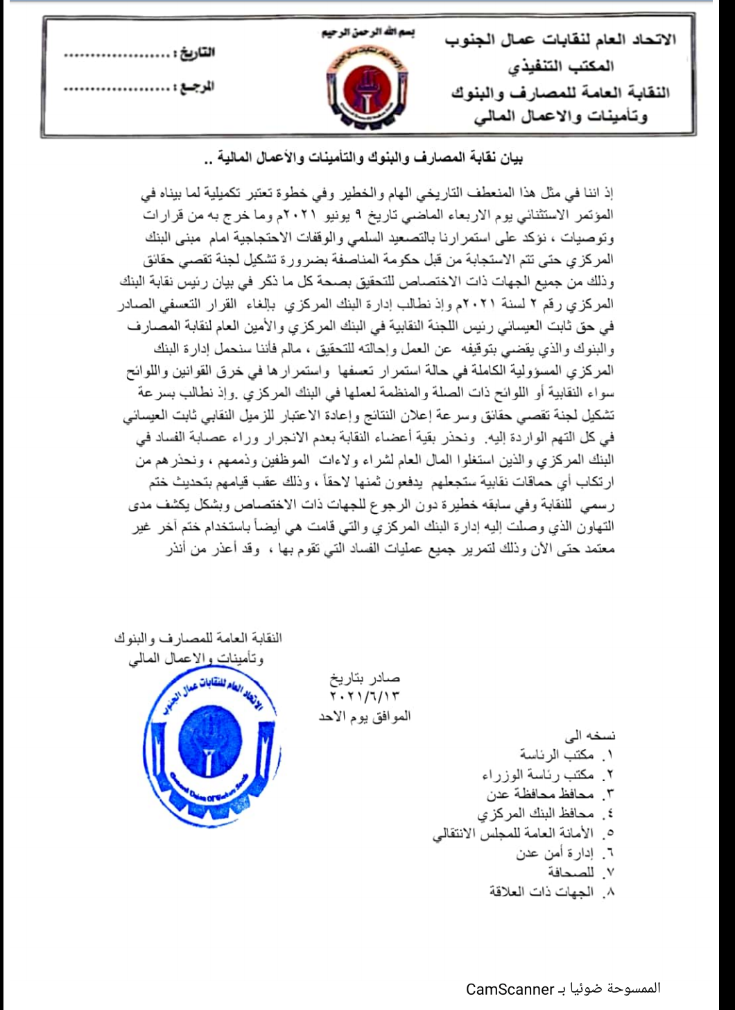 إذ اننا في مثل هذا المتعطف التاريخي الهام والخطير وفي خطوة تعتبر تكميلية لما بيناه في المؤتمر الاستثنائي يوم الاربعاء الماضي تاريخ ۹ يونيو ٢٠٢١ م وما خرج به من قرارات وتوصيات ، نوكد على استمرارنا بالتصعيد السلمي والوقفات الاحتجاجية امام مبنى البنك المركزي حتى تتم الاستجابة من قبل حكومة المناصفة بضرورة تشكيل لجنة تقصي حقائق وذلك من جميع الجهات ذات الاختصاص للتحقيق بصحة كل ما ذكر في بيان رئيس نقابة البنك المركزي رقم ٢ لسنة ٢٠٢١ م وإذ نطالب إدارة البنك المركزي بإلغاء القرار التعسفي الصادر في حق ثابت العيسائي رئيس اللجنة النقابية في البنك المركزي والأمين العام لنقابة المصارف والبنوك والذي يقضي بتوقيفه عن العمل وإحالته للتحقيق ، مالم فأننا ستحمل إدارة البنك المركزي المسؤولية الكاملة في حالة استمرار تعسفها واستمرارها في خرق القوانين واللوائح سواء النقابية أو اللوائح ذات الصلة والمنظمة لعملها في البنك المركزي .وإذ تطالب بسرعة تشكيل لجنة تقصي حقائق وسرعة إعلان النتائج وإعادة الاعتبار للزميل النقابي ثابت العيساني في كل النهم الواردة إليه، وتحتر بقية أعضاء النقابة بعدم الانجرار وراء عصابة الفساد في البنك المركزي والذين استغلوا المال العام لشراء ولاءات الموظفين وذممهم ، وتحذرهم من ارتكاب أي حماقات نقابية ستجعلهم يدفعون ثمنها لاحقا ، وذلك عقب قيامهم بتحديث ختم رسمي للنقابة وفي سابقه خطيرة دون الرجوع للجهات ذات الاختصاس وبشكل يكشف مدى التهاون الذي وصلت إليه إدارة البنك المركزي والتي قامت هي أيضا باستخدام ختم آخر غير معتمد حتى الآن وذلك لتمرير جميع عمليات الفساد التي تقوم بها ، وقد أعدر من أنذر