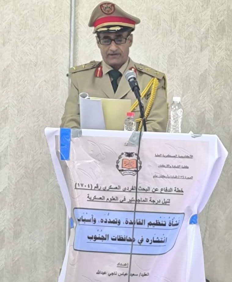في إنجاز علمي جديد، منحت الأكاديمية العسكرية العليا – كلية القيادة والأركان في العاصمة عدن، درجة الماجستير بامتياز للعقيد سعيد عباس ناجي، بعد مناقشة بحثه تحت عنوان: “نشأة تنظيم القاعدة وتمدده وأسباب انتشاره في محافظات الجنوب.