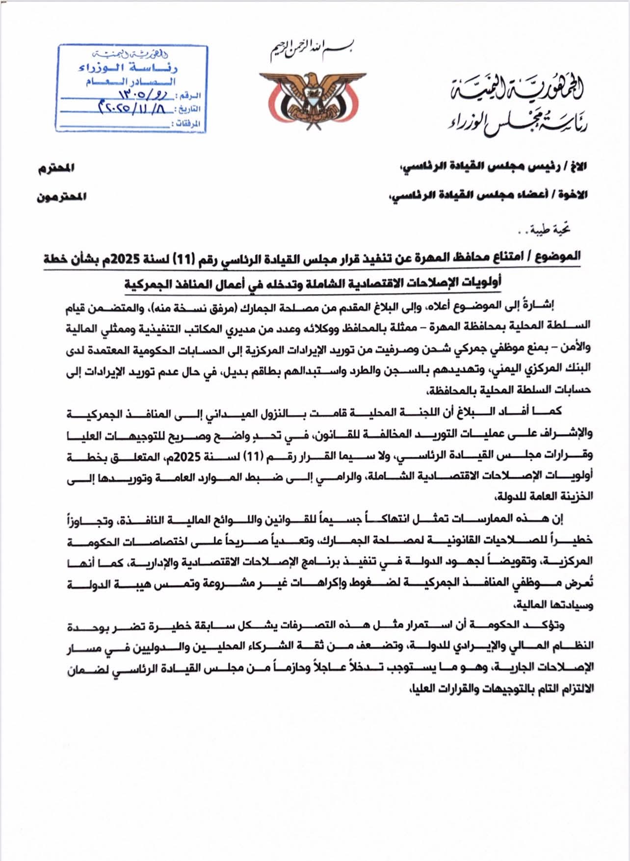 حذر رئيس مجلس الوزراء سالم بن بريك في مذكرة رفعها إلى مجلس القيادة الرئاسي من خطورة تمرد محافظ المهرة محمد علي ياسر وامتناعه عن تنفيذ قرار مجلس القيادة الرئاسي رقم (11) لسنة 2025 المتعلق بخطة أولويات الإصلاحات الاقتصادية الشاملة والرامي إلى ضبط الموارد العامة وتوريدها إلى الخزينة العامة للدولة في تحد مباشر من خلال توجيهاته الصريحة بعدم توريد إيرادات منفذ شحن إلى البنك المركزي.