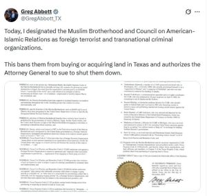 وأكد أن “هؤلاء المتطرفين غير مرحب بهم في ولايتنا ويحظر عليهم الآن اقتناء أي ممتلكات عقارية في تكساس”.