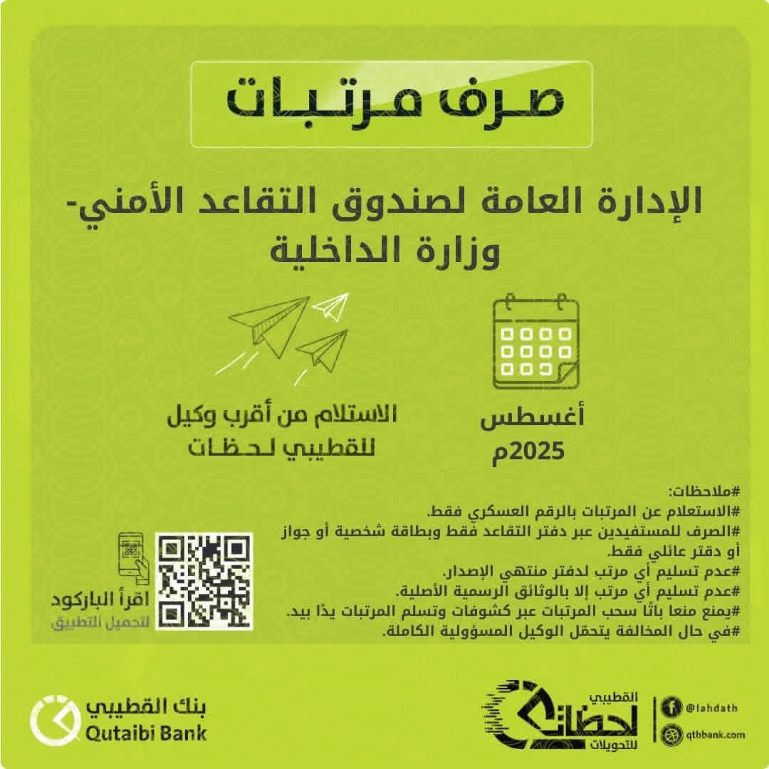 الداخلية تعلن صرف معاشات متقاعديها والأمن السياسي لشهر أغسطس عبر بنك القطيبي