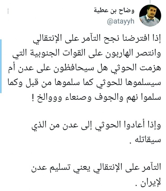 وقال في تغريدة على حسابه بموقع التواصل الاجتماعي تويتر، اليوم إننا: “إذا افترضنا نجح التآمر على الانتقالي وانتصر الهاربون على القوات الجنوبية التي هزمت الحوثي، هل سيحافظون على عدن أم سيسلموها للحوثي كما سلموها من قبل؟ كما سلموا نهم والجوف وصنعاء ألخ!”.