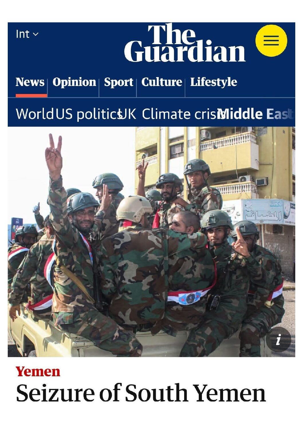 نشرت صحيفة الغارديان البريطانية اليوم الإثنين تقريرا كشفت فيه أن المجلس الانتقالي الجنوبي رسخ سيطرته الأمنية والعسكرية في محافظات الجنوب ونشر نحو عشرة آلاف جندي في محافظتي حضرموت والمهرة ضمن خطة شاملة لحفظ الأمن والاستقرار في خطوة تفتح الباب أمام إمكانية إعلان الجنوب استقلاله وإعادة اليمن إلى دولتين لأول مرة منذ عام 1990.