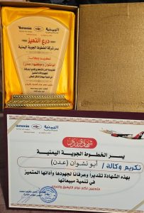 تكريما له بتميزه وللعام الثاني على التوالي.. الخطوط الجوية اليمنية تمنح وكالة ابو« نشوان» الشعيبي درعا
