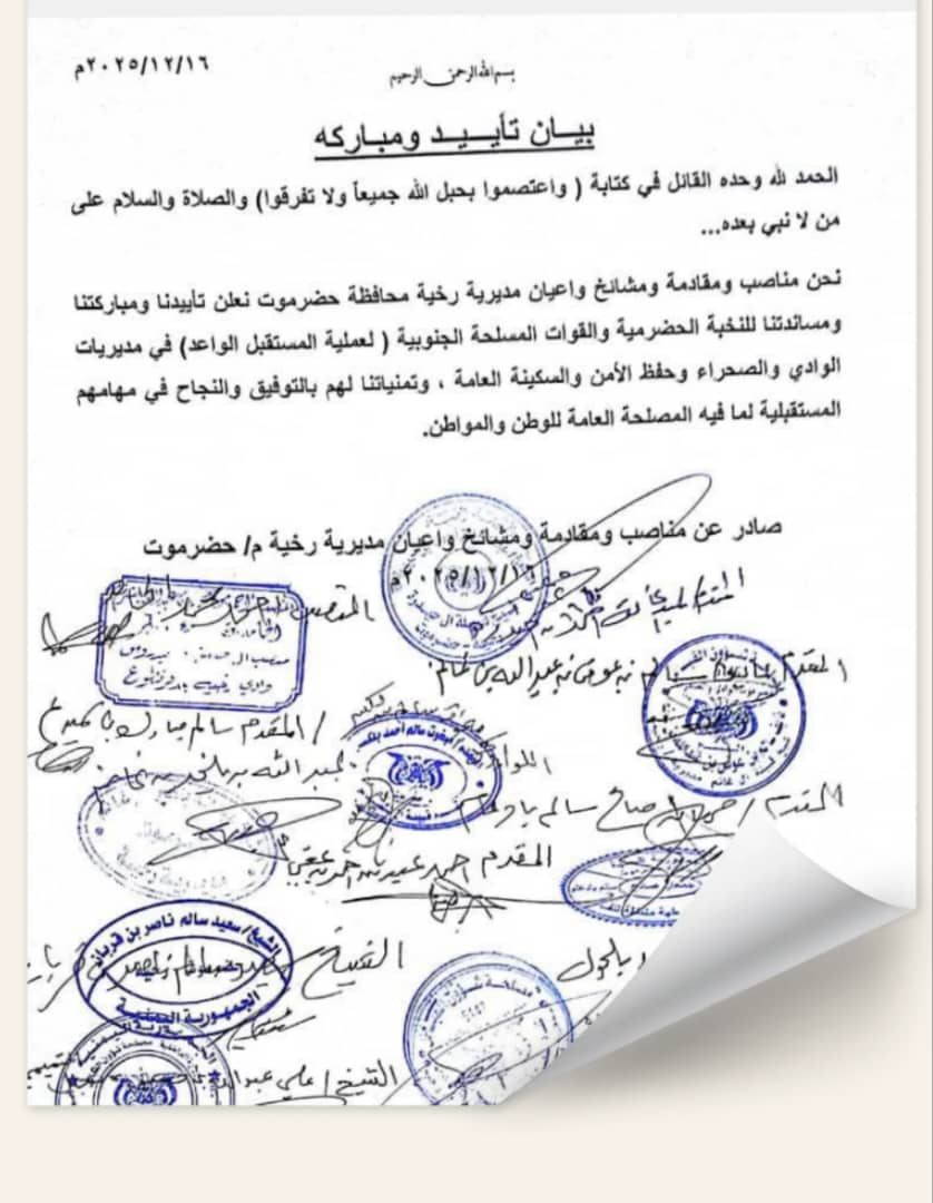 اعلنت الشخصيات الإجتماعية والمشائخ والأعيان في مديرية رخية في بيان تلقى النقابي الجنوبي نسخة منه مباركتها وتأييدها للانتصارات التي حققتها القوات المسلحة الجنوبية بكافة تشكيلاتها العسكرية بعملية المستقبل الواعد في وادي حضرموت