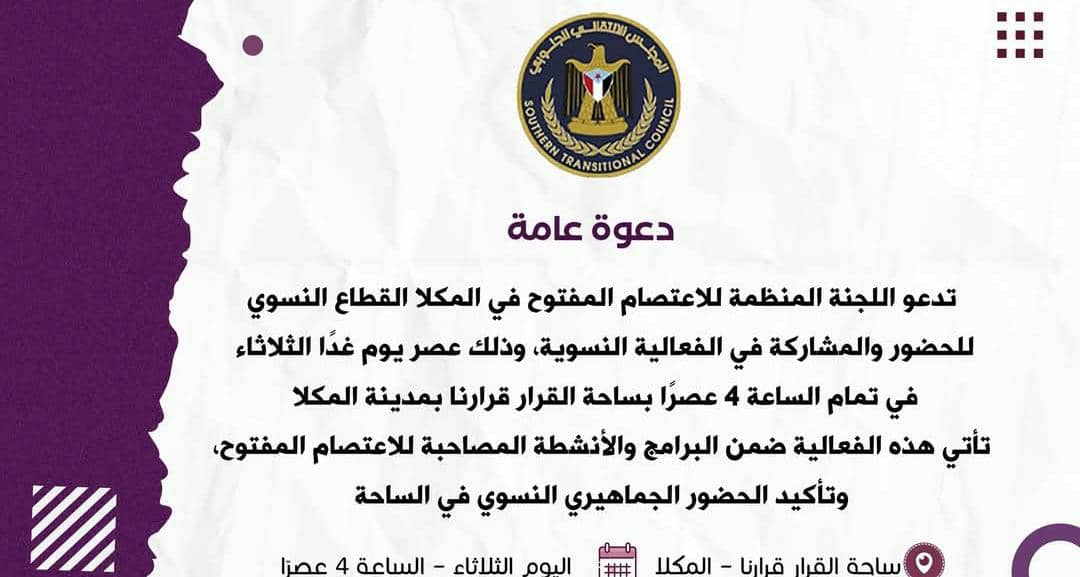 وجّهت اللجنة المنظمة للاعتصام المفتوح في مدينة المكلا دعوة عامة إلى القطاع النسوي للمشاركة في الفعالية النسوية المقررة عصر يوم غدٍ الثلاثاء، في تمام الساعة الرابعة، بساحة «القرار قرارنا» بمدينة المكلا.