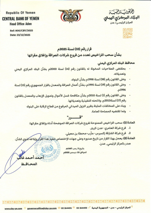 أصدر محافظ البنك المركزي أ. أحمد أحمد غالب قرار رقم (33) لعام 2025م، بشأن سحب الترخيص الممنوحة لعدد من فروع شركات الصرافة المخالفة وإغلاق مقراتها، والمثبتة بتقرير النزول الميداني المرفوع من قطاع الرقابة على البنوك.