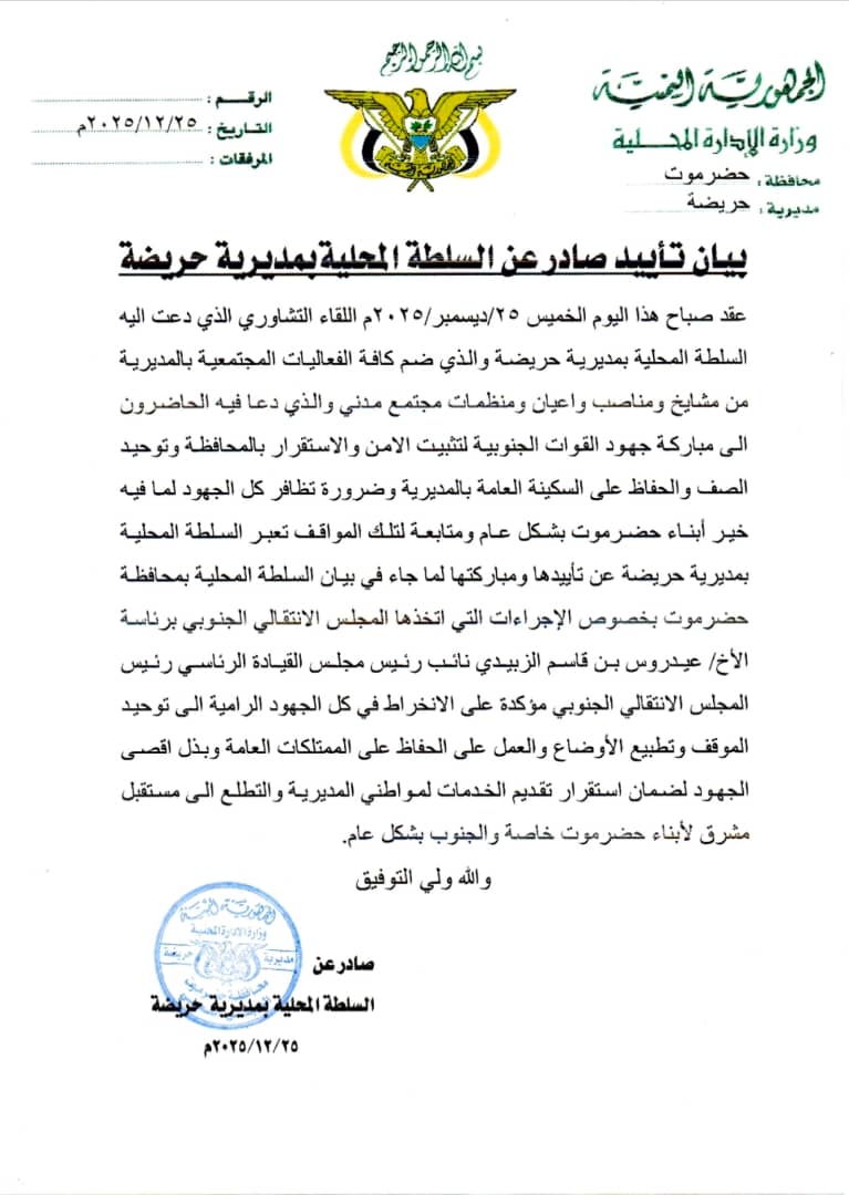 ومتابعة لتلك المواقف تعبر السلطة المحليه بمديرية حريضة عن تأييدها ومباركتها لما جاء في بيان السلطة المحليه بمحافظة حضرموت بخصوص الإجراءات التي اتخذها المجلس الانتقالي الجنوبي برئاسة/الاخ عيدروس بن قاسم الزبيدي نائب رئيس مجلس القيادة الرئاسي رئيس المجلس الانتقالي الجنوبي مؤكدة على الانخراط في كل الجهود الرامية إلى توحيد الموقف وتطبيع الأوضاع والعمل على الحفاظ على الممتلكات العامة وبذل إقصاء الجهود لضمان استقرار تقديم الخدمات لمواطني المديرية والتطلع إلى مستقبل مشرق لأبناء حضرموت خاصة والجنوب بشكل عام